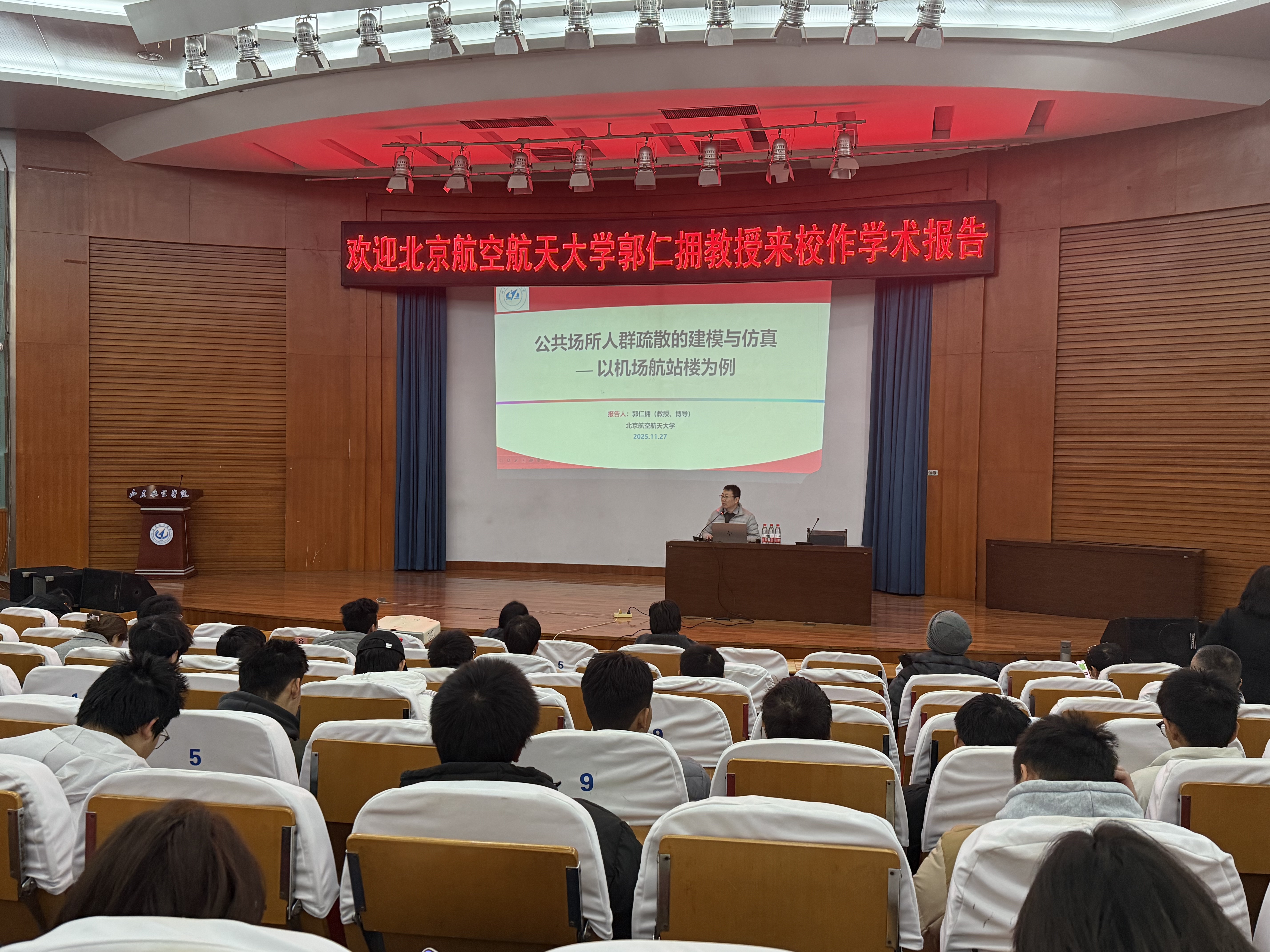 11月27日上午,北京航空航天大学郭仁拥教授应邀来我校作学术报告,报告题目为《公共场所人群疏散的建模与仿真—以机场航站楼为例》,深入解析行人疏散建模的前沿研究与应用价值。本次报告会由机场学院科研秘书王荣娟老师主持,学院科研骨干教师和相关专业研究生、本科生参加了报告会。
