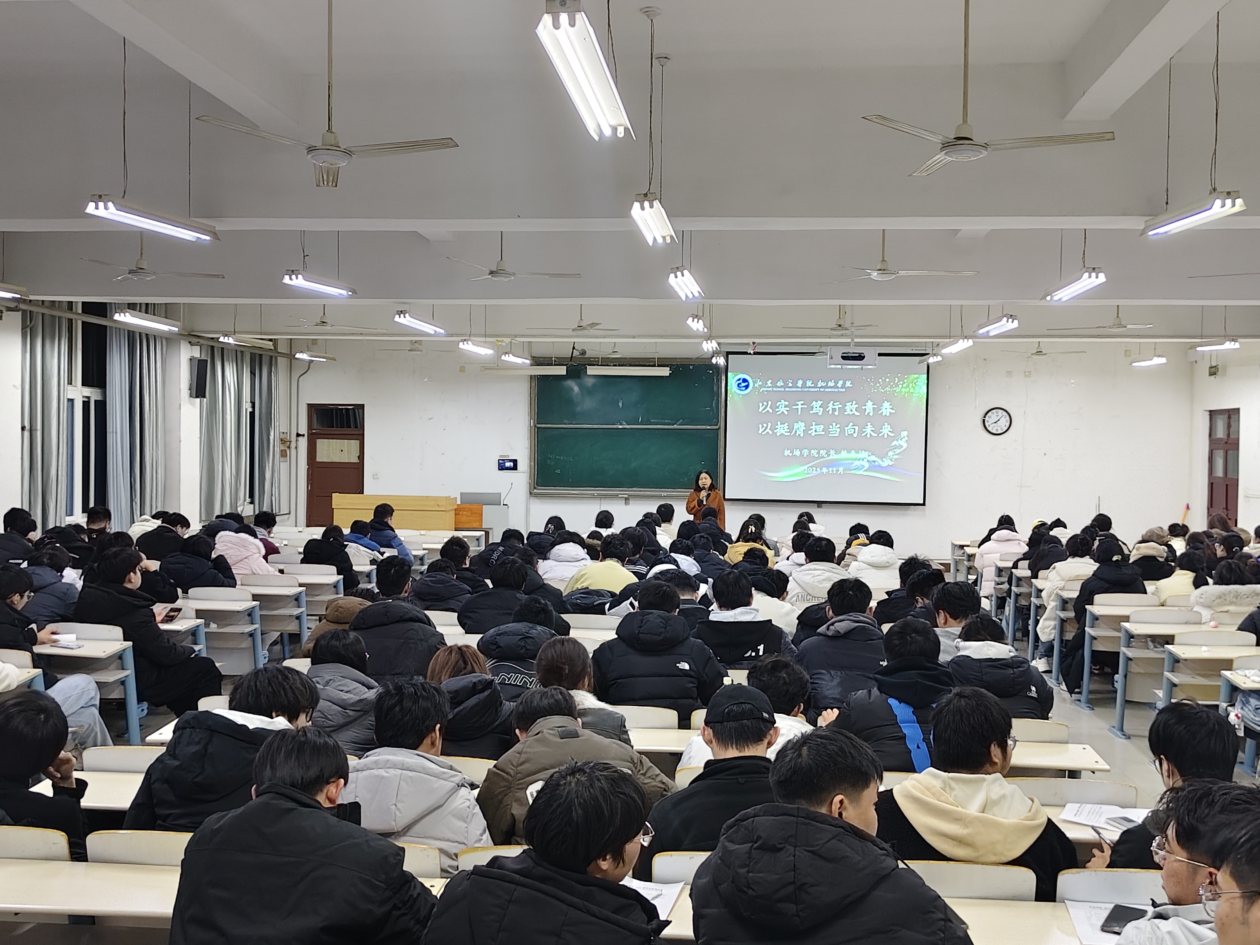 为深入贯彻落实习近平新时代中国特色社会主义思想,深化“大思政课”建设成效,引导大二学生在学业进阶关键期找准方向、锤炼本领,2025年3月2日,机场学院院长以“以实干笃行致青春 以挺硬担当向未来”为主题,为2023级全体学生作思想政治教育专题报告。此次报告立足大二下学期成长节点,旨在为学生筑牢思想根基、明确发展路径,凝聚青春奋进力量。